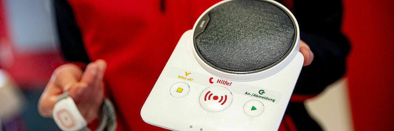 Den mobilen Hausnotruf-Sender immer am Körper tragen, um im Notfall den Notrufknopf zu drücken. Sofort wird eine Sprechverbindung mit der Hausnotrufzentrale hergestellt.