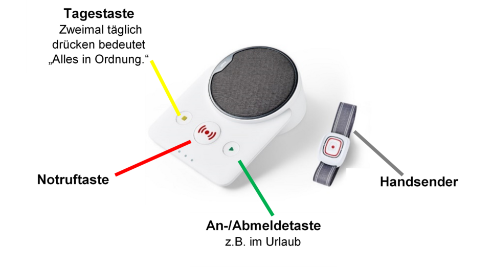 Sie benötigen lediglich die sogenannte Basisstation zusätzlich zu Ihrem Telefon, diese ist nicht viel größer als das Telefon selbst. Alle Tasten sind hinterleuchtet und können über fühlbare Piktogramme ertastet werden. Die Basisstation wird durch den mobilen Funksender ergänzt, der so klein ist, dass Sie ihn bequem am Handgelenk oder wie eine Kette um den Hals tragen können. Notrufe können ausgelöst werden durch die Notruftaste, den mobilen Funksender, die Sicherheitsuhr (wenn die gelbe Taste über einen bestimmten Zeitraum hinaus nicht gedrückt wird), aber auch durch Sensoren wie Funk-Rauchmelder, Funk-Bewegungsmelder oder Funk-Kontaktmelder.