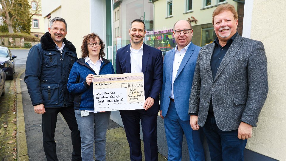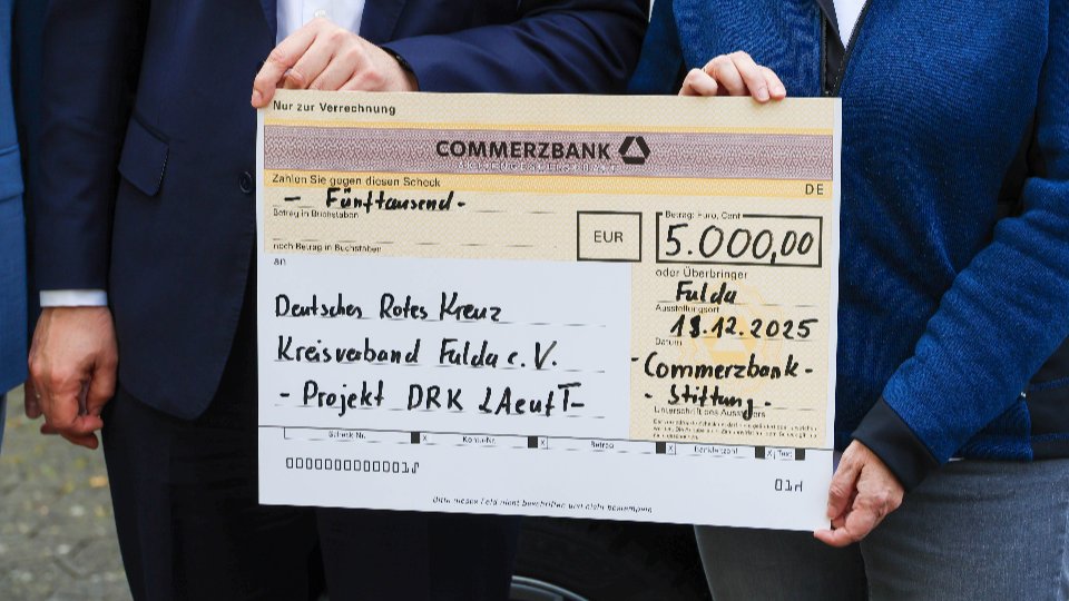 Hilders/Fulda – Das Projekt LAeufT (Lokaler Ansprechpartner einzigartiger und flexibler Teilhabe) des Deutschen Roten Kreuzes Fulda erhält eine wichtige finanzielle Unterstützung: Die Commerzbank-Stiftung fördert das Engagement in Hilders mit einer Spende in Höhe von 5.000 Euro. Im Rahmen einer kleinen Übergabezeremonie nahmen Projektleiterin Nicolette Salmann und der DRK-Vorstandsvorsitzende Christoph Schwab den Spendenscheck aus den Händen von Christian Torschl und Thorsten Büttner (Commerzbank) entgegen. Bürgermeister Ronny Günkel begleitete die Übergabe und würdigte die Bedeutung des Projekts für die Gemeinde.