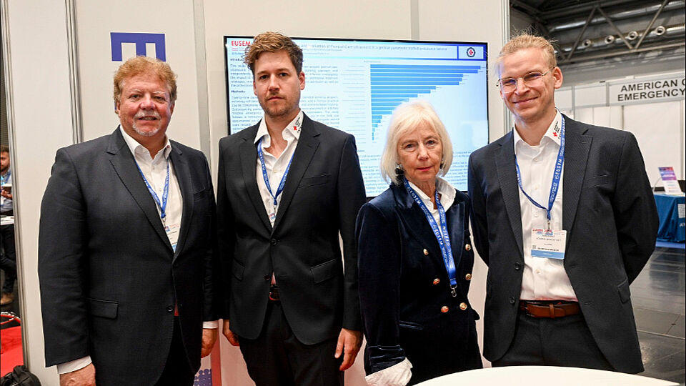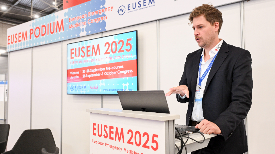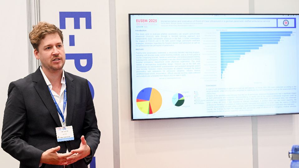 „EUSEM 2025“ - das ist der führende „European Emergency Medicine Congress“, der Ende September mehr als 4.000 Mediziner aus der ganzen Welt nach Wien führte. Mit dabei: Notfallmediziner und Verantwortliche vom Deutschen Roten Kreuz (DRK) aus Fulda. Das Prehospital-Ultraschallprojekt POCUS stand erneut im Fokus der hochkarätigen Vorträge im Bereich der präklinischen Notfallmedizin, die auf Englisch vor Fachpublikum gehalten und kritisch diskutiert wurden. Für Adrian Böhm, Medizinischer Leiter Fachbereich Notfallmedizin beim DRK Fulda und POCUS-Projektleiter, ist die Diskussion und der „Austausch auf Augenhöhe“ mit Kollegen etwa aus New Orleans (USA) und Melbourne (Australien) ein „wichtiger Meilenstein“ für das Projekt.
