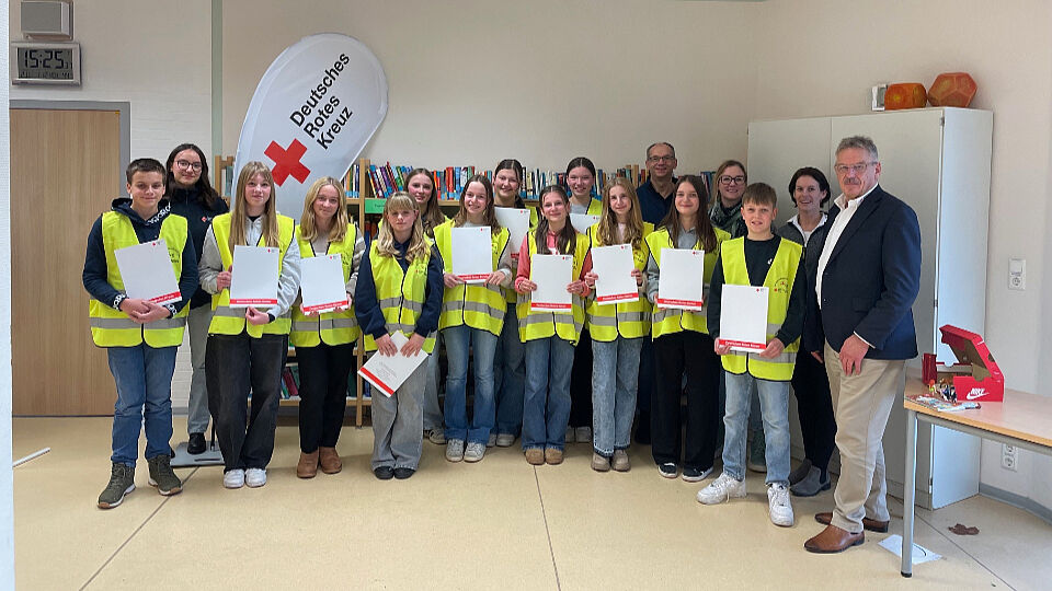 Vierzehn neuen Schulsanitäterinnen und Schulsanitäter an der Mittelpunktschule „Hohe Rhön“ in Hilders konnten ihre Ausbilder Stella Burgart und Michael Tremmel vom DRK Fulda die erfolgreiche Teilnahme an der Abschlussprüfung des Schulsanitätslehrgangs bescheinigen.
